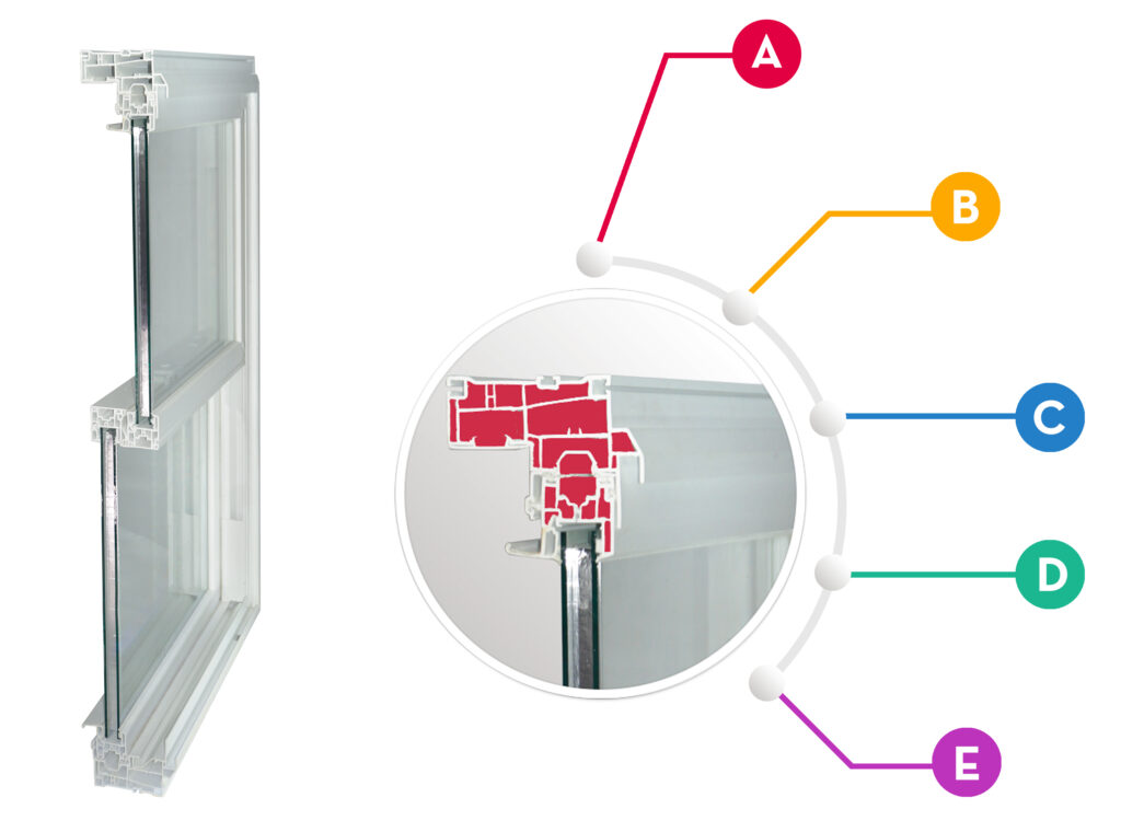 E - Quiet quadruple weather strip sealing system located on the sash for air and water tightness