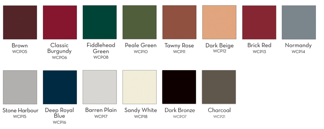 We offer 18 exterior paint colour choices which are water based and environmentally friendly as well as weather and fade-resitant.