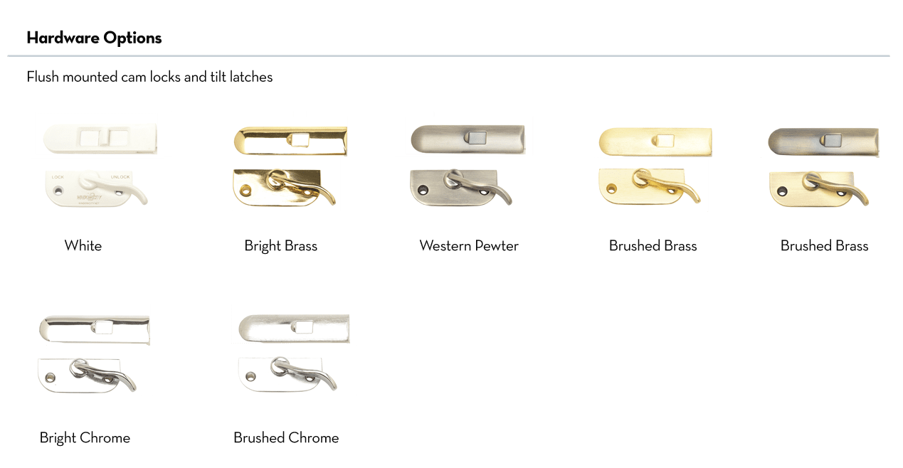 The beauty and distinction of the Heritage Collection can be customized to your design choices. The Premium Hardware system offers several finishes and its low profile nesting handle adds elegance to your windows. The stainless steel construction is built to last and the dual arm action ensures a smooth operation for years to come. The Premium Hardware is available with 8 finish options to fully customize your window selections.